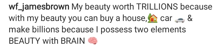“My beauty worth TRILLIONS because with my beauty you can buy a house, car & make billions because I possess two elements BEAUTY with BRAIN,” he wrote.
