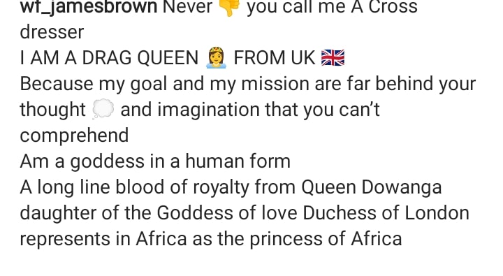 Sharing pictures of himself on his verified Instagram page, the popular social media influencer described himself as a goddess in human form, sending a stern warning to everyone not to refer to him as a crossdresser but a UK drag queen.
