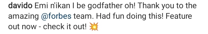 Thanking the Forbes team for the iconic feature, Davido Adeleke described himself as a godfather.
