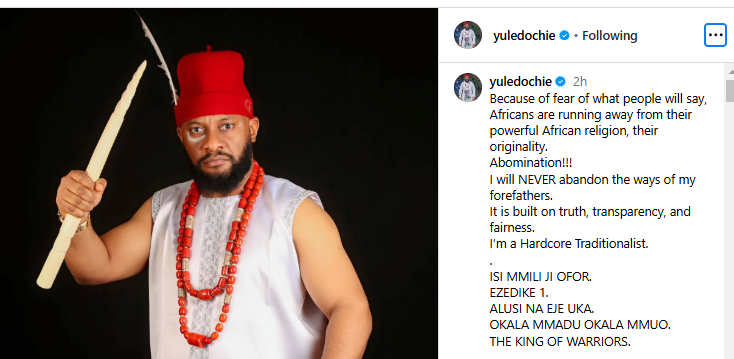 Controversial actor, one-time presidential aspirant, and ex-preacher, Yul Edochie reveals that he has reverted to being a traditionalist, one year after he opened a ministry.