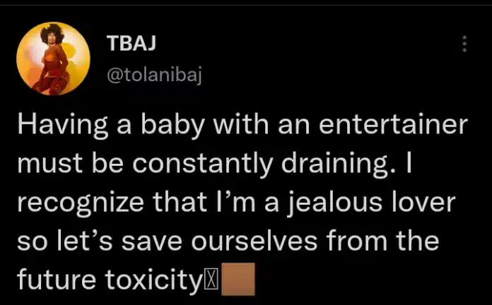 Tolanibaj has taken to her page on Twitter to disclose that she is a jealous lover and cannot take the pressure that comes with giving birth to a child with a celebrity.