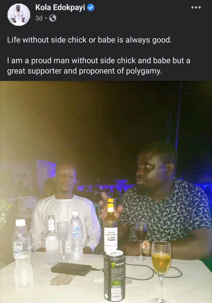 Kola Edokpayi, who had earlier said that the only solution to extramarital affairs is polygamy, says he’s very proud of not having a side chick as well.