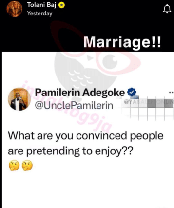 I’m convinced people are pretending to enjoy marriage – Tolanibaj