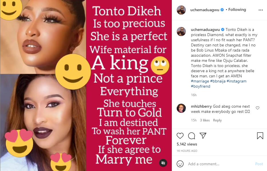 “Tonto Dikeh is a priceless Diamond, what exactly is my usefulness if I no fit wash her PANT? Destiny can not be changed, me I no be Bob Linus Mbaka of rada rada association. AWON Snapchat filter make me fine like Ojuju Calabar. Tonto Dikeh is too priceless, she deserve a king not a anywhere belle face man, can I get an AMEN”