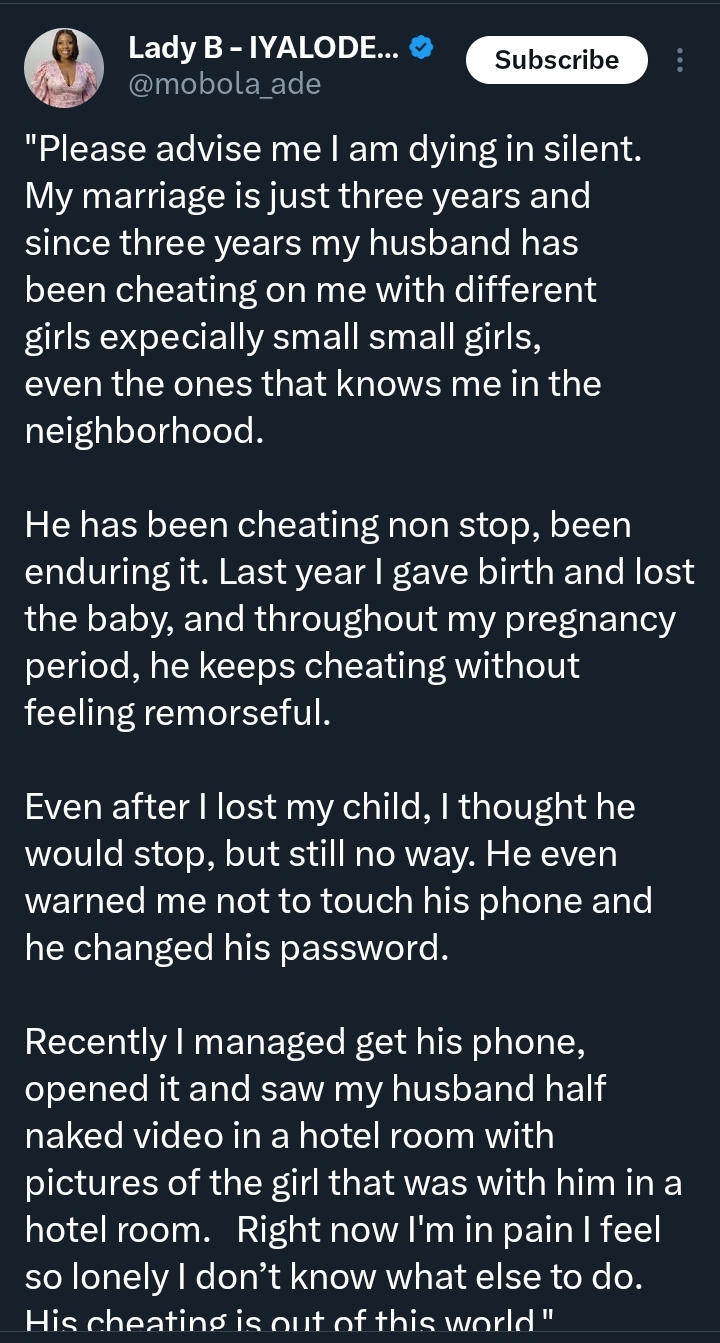 In her emotional message, the woman said she has been married for three years, and according to her, the alleged cheating started from the early days of the union.