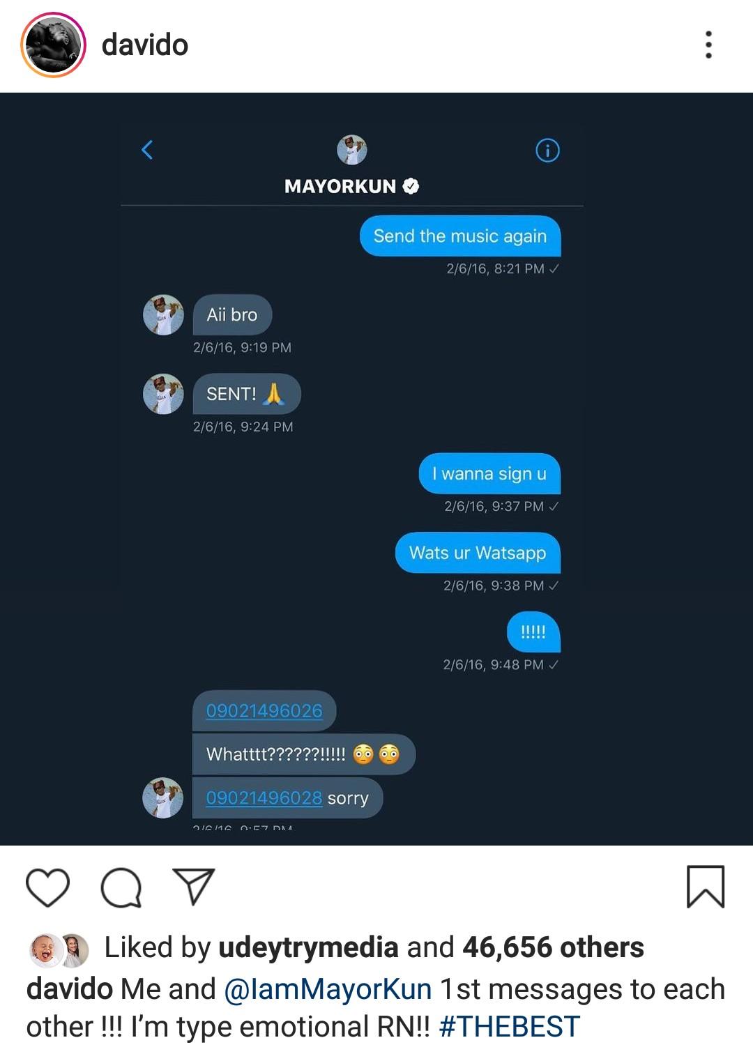 Nigerian singer, David Adeleke, professionally known as Davido has shared his first chat with fellow singer and signee, Mayorkun.