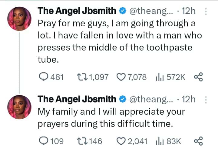“Pray for me guys, I am going through a lot. I have fallen in love with a man who presses the middle of the toothpaste tube. My family and I will appreciate your prayers during this difficult time.”