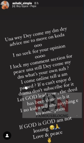 Ashabi Simple has recently taken to his Instagram page to reveal that people have been taking to her comment section to give her unsolicited opinions.