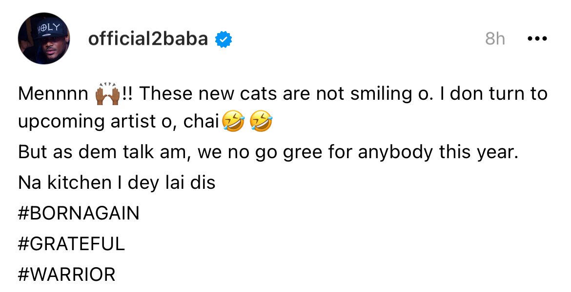 On his Instagram handle, the popular musician wrote: “Meeen!, These new cats are not smiling o. I don turn to upcoming artist o, chai. But as them talk am, we no go gree for anybody this year. na kitchen I dey like this.”