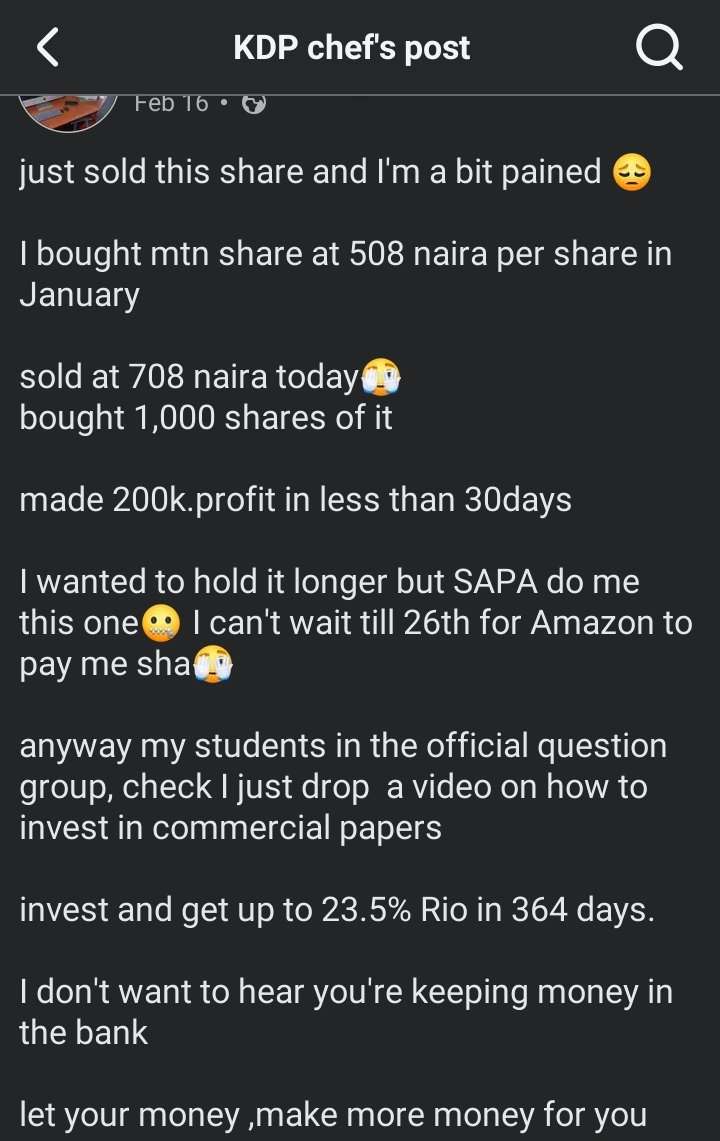 ”Just sold this share and I’m a bit pained. I bought mtn share at 508 naira per share in January. Sold at 708 naira today. Bought 1,000 shares of it. Made 200k profit in less than 30 days”, The post reads in part