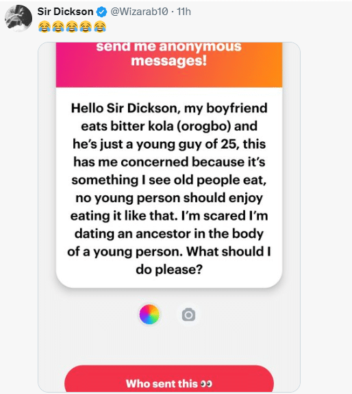 “Hello Sir Dickson, my boyfriend eats bitter kola (orogbo) and he’s just a young guy of 25, this has me concerned because it’s something I see old people eat, no young person should enjoy eating it like that. I’m scared I’m dating an ancestor in the body of a young person. What should I do please?,” She wrote.