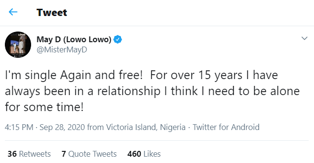 “I’m single again and free!” – Singer May D says as his marriage crashes after 2years