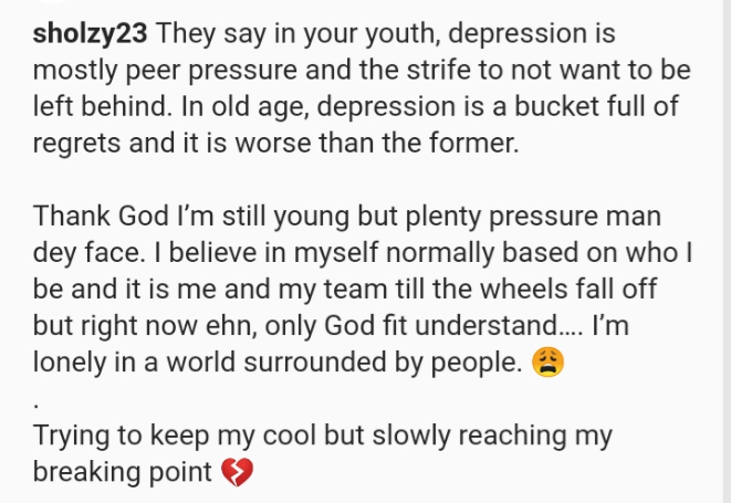 Thank God I’m still young but plenty pressure man dey face. I believe in myself normally based on who I be and it is me and my team till the wheels fall off but right now ehn, only God fit understand…. I’m lonely in a world surrounded by people. ?Trying to keep my cool but slowly reaching my breaking point ?”