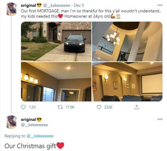 The entrepreneur, @__kekeeeeee on the microblogging platform, Twitter, revealed that she got her first mortgage house and she’s so grateful for the achievement.