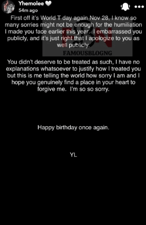 On her birthday, Yhemolee took to his Snap Chat page to publicly apologize for humiliating her with his words and actions.