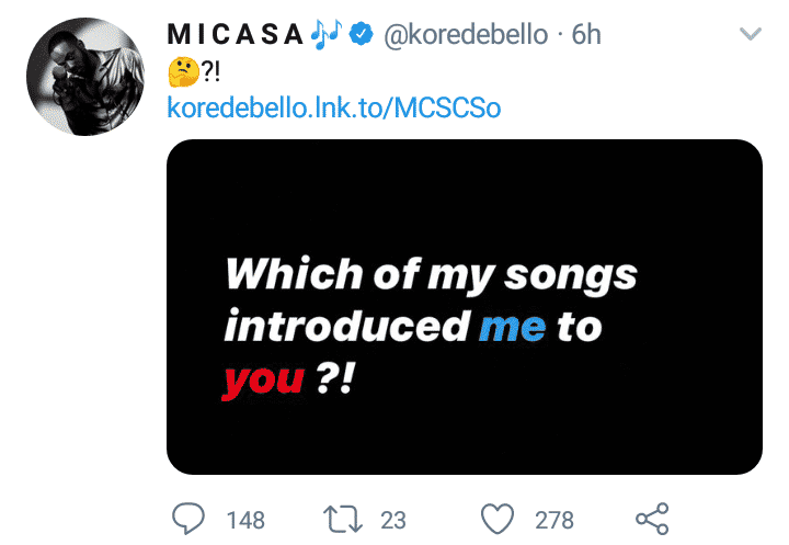 It all began when the singer took to Twitter to seek from his fans and followers, which of his songs made them get to know him.