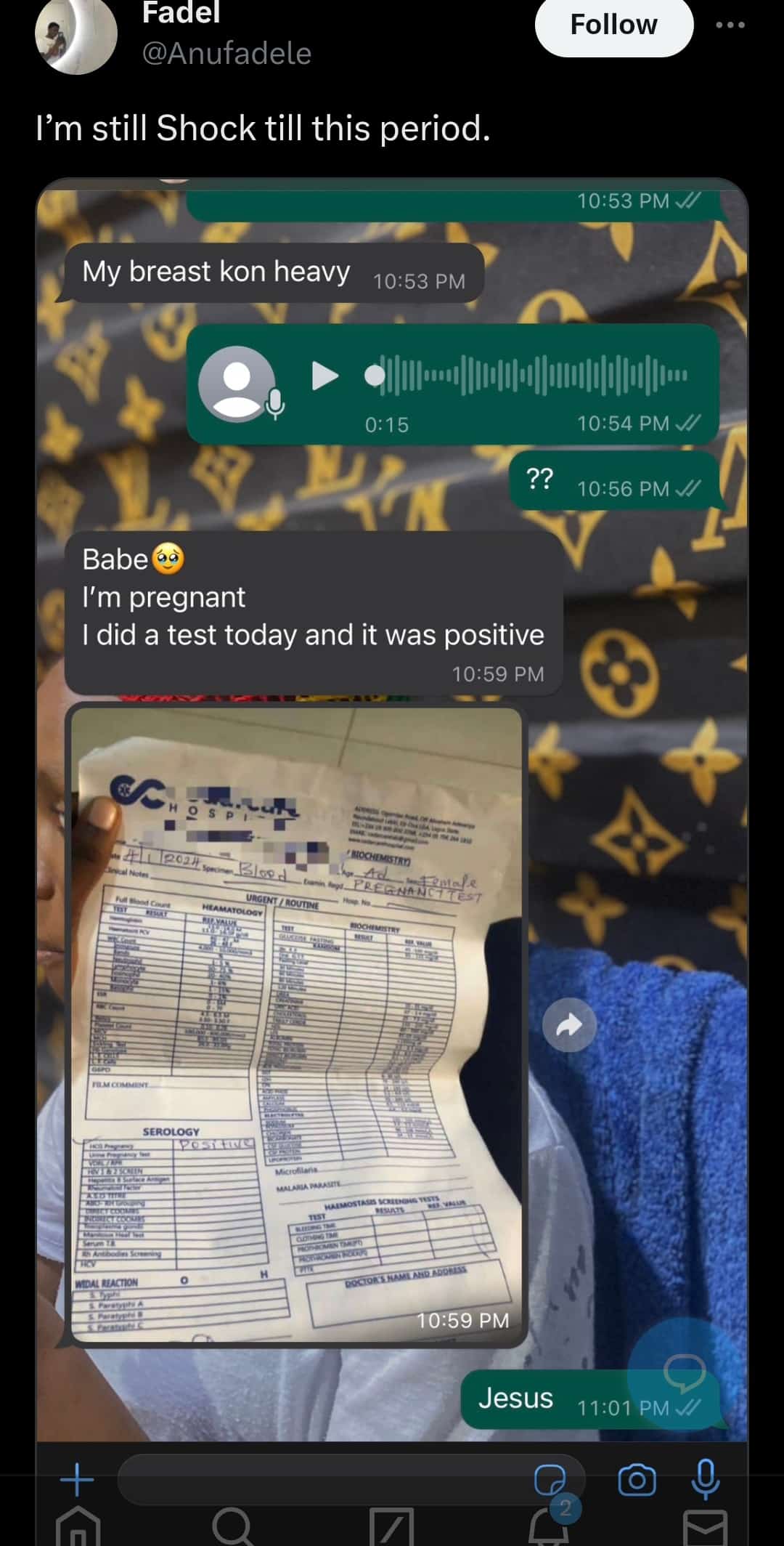 She shared a test result indicating that she’s pregnant. She mentioned that she took the test that very day and the results show she’s pregnant. In response, the man replied, “Jesus.”