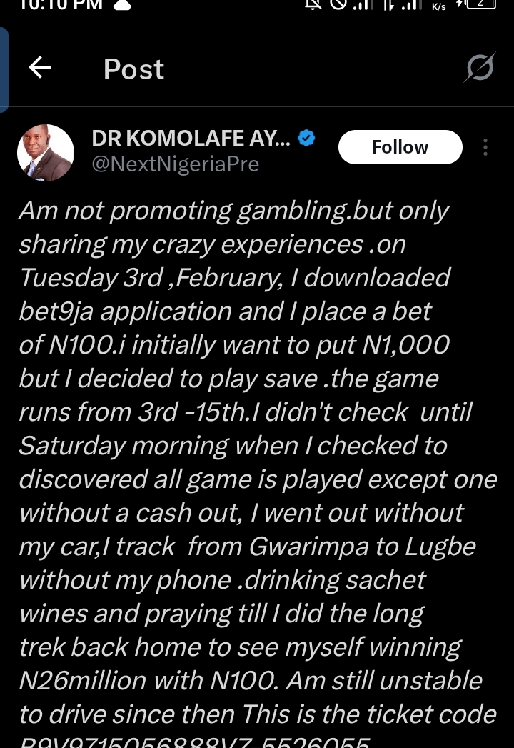 Subsequently, he trekked from Gwarimpa to Lugbe without his phone, drinking sachet water and praying, until he saw the winning slip of ₦26 million, leaving him unstable to drive