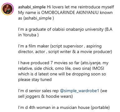 Popular actress and the fourth baby mama of singer Portable, Ashabi Simple reintroduces herself to Nigerians as she lists out her achievements, profession, and qualifications.