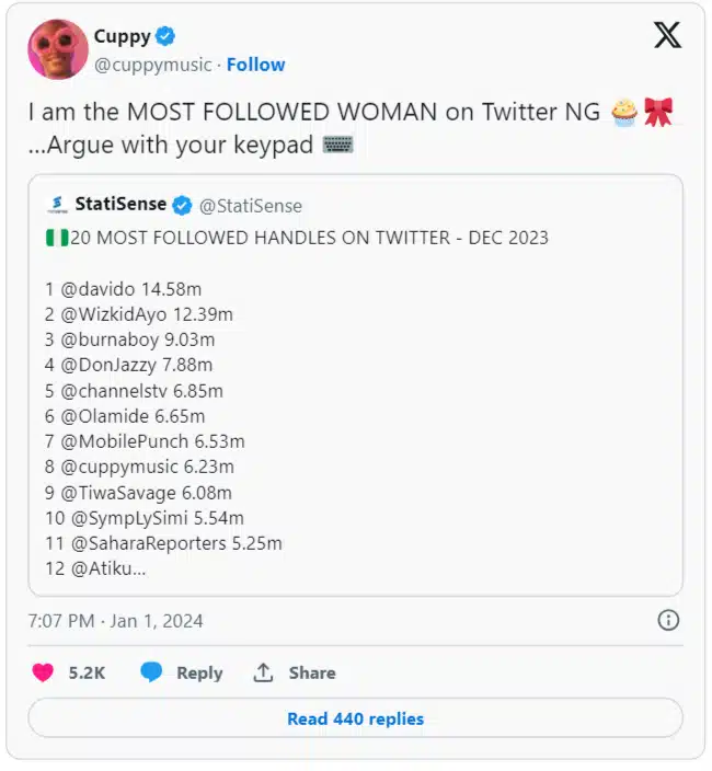 DJ Cuppy responded to the thrilling news by sharing her achievement on Twitter and jokingly challenging anyone who questioned the data’s veracity to “argue with their keypads.”