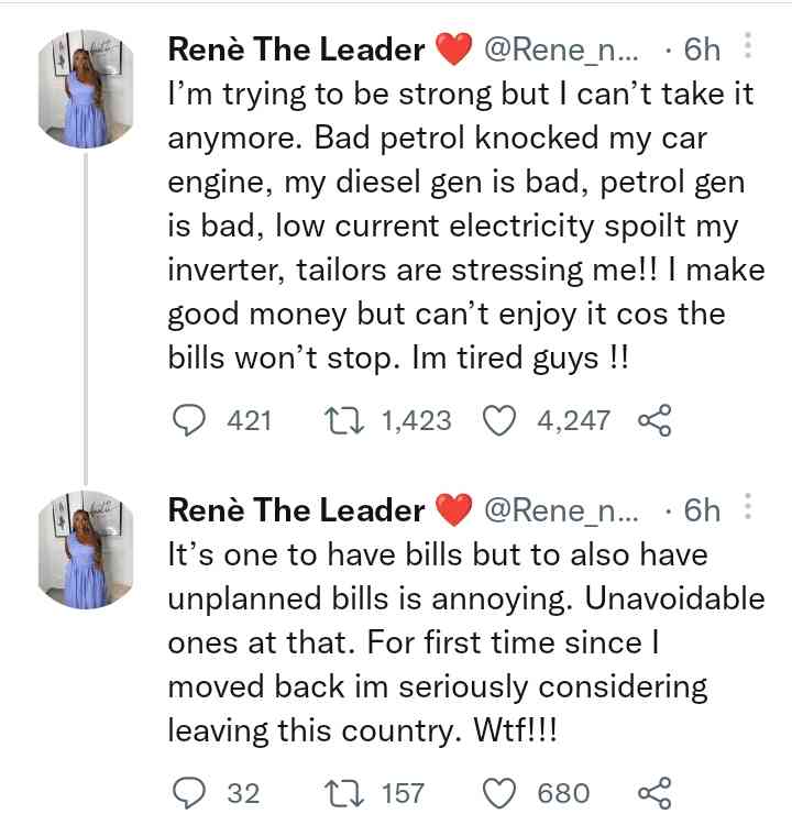 “I’m trying to be strong but I can’t take it anymore. Bad petrol knocked my car engine, my diesel gen is bad, petrol gen is bad, low current electricity spoilt my inverter, tailors are stressing me!! I make good money but can’t enjoy it cos the bills won’t stop. I’m tired guys !!