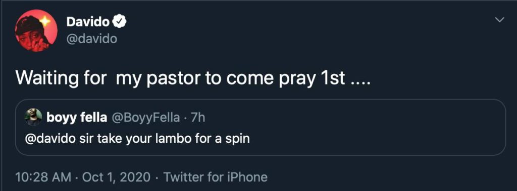 “I’m waiting for my pastor to come pray first” – Davido replies fan who asked him to take his lamborghini for a spin