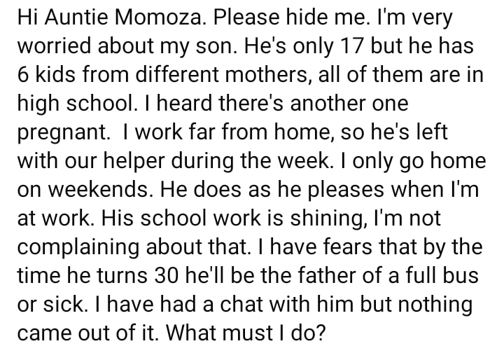“Please hide me. I’m very worried about my son. He’s only 17 but he has 6 kids from different mothers, all of them are in high school. I heard there’s another one pregnant. I work far from home, so he’s left with our helper during the week. I only go home on weekends. He does as he pleases when I’m at work. His school work is shining, I’m not complaining about that. I have fears that by the time he turns 30 he’ll be the father of a full bus or sick. I have had a chat with him but nothing came out of it. What must I do?”