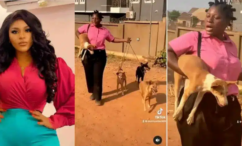 In the scene shared by actress Destiny Etiko, she was made to carry a dog in her right arm and drag three others in chains with the other hand.