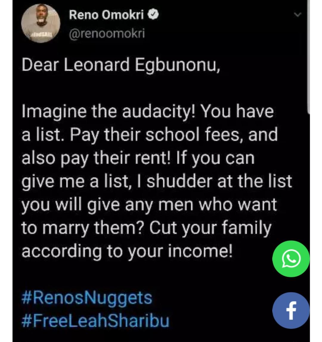 “Dear Leonard Egbunonu, Imagine the audacity! You have a list. Pay their school fees, and also pay their rent! If you can give me a list, I shudder at the list you will give any men who want to marry them? Cut your family according to your income”