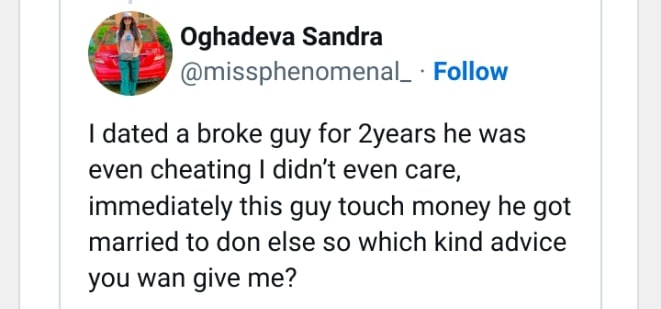 “I dated a broke guy for 2years he was even cheating I didn’t even care, immediately this guy touch money he got married to don else so which kind advice you wan give me?”