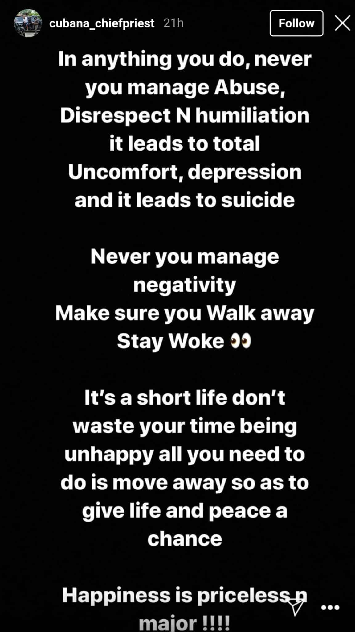‘In anything you do, never you manage abuse’ – Cubana ChiefPriest, writes