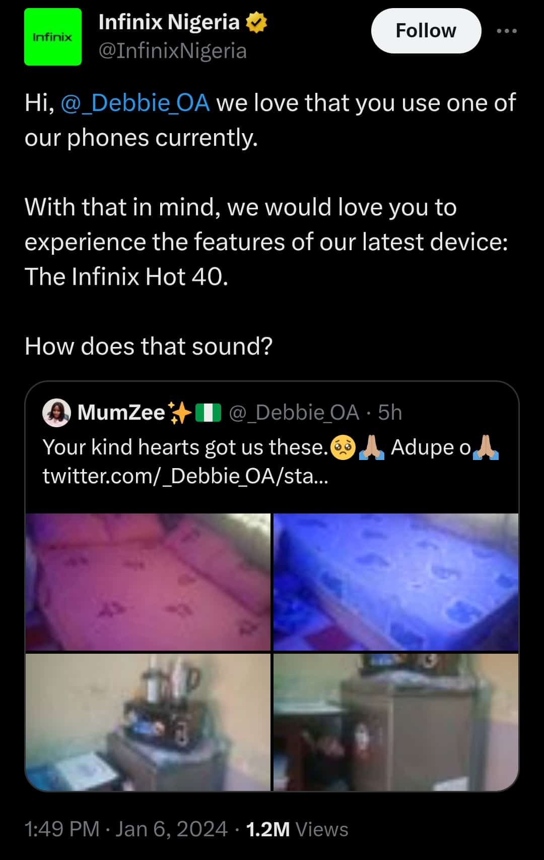 Infinix Nigeria wrote: “Hi, @_Debbie_OA, we love that you currently use one of our phones. With that in mind, we would love for you to experience the features of our latest device: The Infinix Hot 40. How does that sound?”