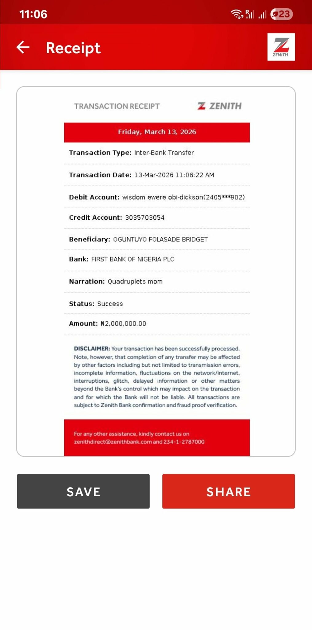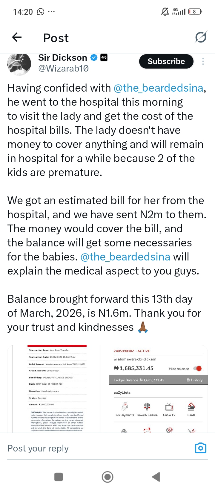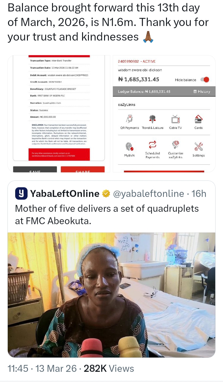 Wizarab also disclosed that a balance of ₦1.6 million remained as of March 13, 2026, while thanking supporters who contributed to the effort.