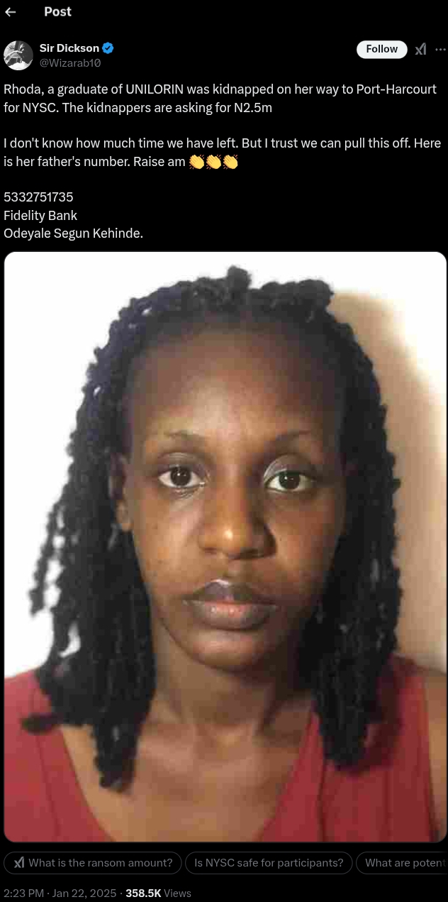 His post read: “Rhoda, a graduate of UNILORIN, was kidnapped on her way to Port Harcourt for NYSC. The kidnappers are asking for ₦2.5 million.”