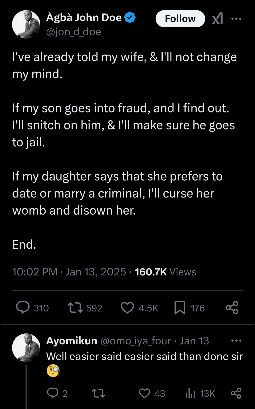 His post read: “I’ve already told my wife, and I won’t change my mind. If my son goes into fraud and I find out, I’ll snitch on him and make sure he goes to jail.”