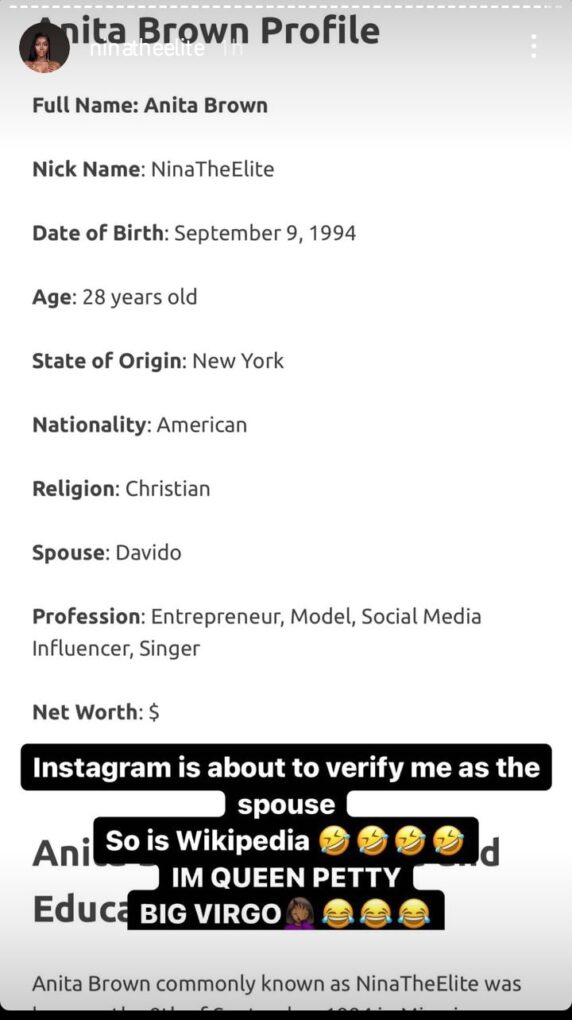 “Instagram is about to verify me as the spouse. So is Wikipedia. I’m Queen Petty. Big Virgo”. Anita declared.