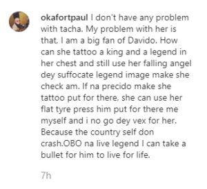 According to the Instagram troll with the handle @okafortpaul, “I don’t have any problem with tacha. My problem with her is that, I am a big fan of Davido. How can she tattoo a king and a legend in her chest and still use her falling angel dey suffocate legend image make she check am. If na precido make she tattoo put for there, she can use her flat tyre press him put for there me myself and i no go dey vex for her. Because the country self don crash.OBO na live legend I can take a bullet for him to live for life.”