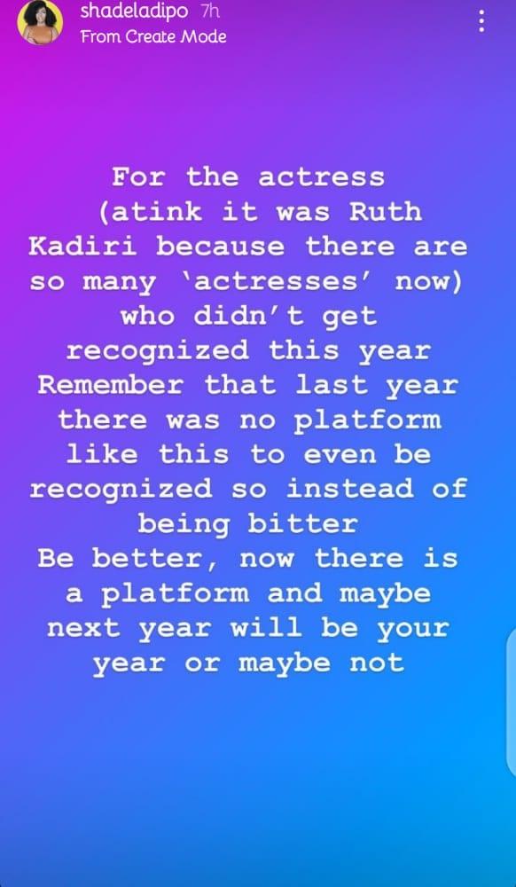 “For the actress (atink it was Ruth Kadiri because there are so many ‘actresses’ now) who didn’t get recognized this year Remember that last year there was no platform like this to even be recognized so instead of being bitter Be better, now there is a platform and maybe next year will be your year or maybe not”
