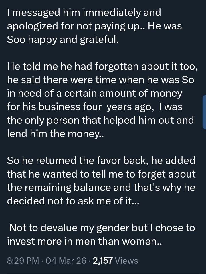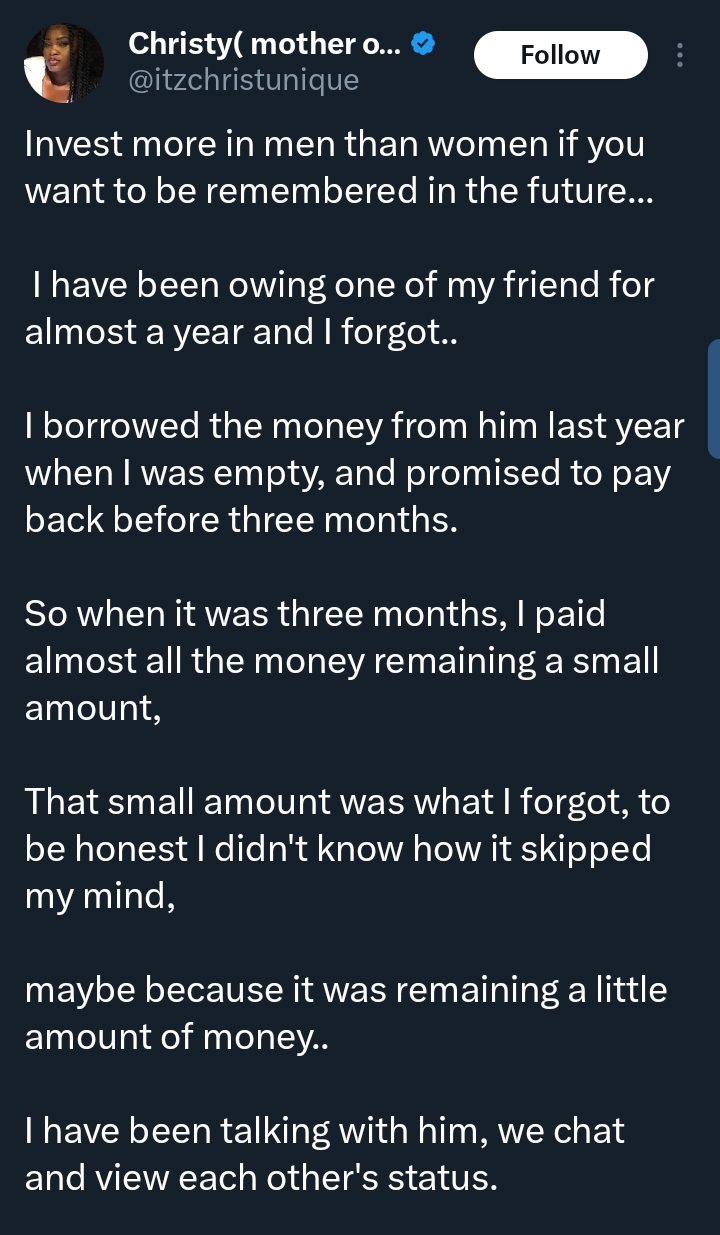 A Nigerian lady has stirred conversation on social media after sharing a personal story about loyalty, gratitude, and why she prefers investing more in men than women.