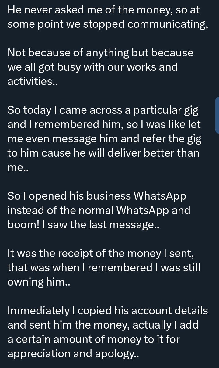 The woman, who posted on X, formerly known as Twitter, narrated how a forgotten debt reminded her of a past act of kindness and changed her perspective about trust.