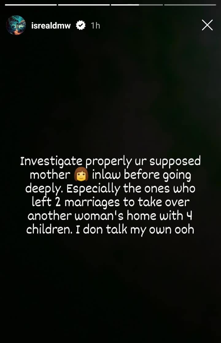 “Investigate properly ur supposed mother inlaw before going deeply Especially the ones who left 2 marriages to take over another woman’s home with 4 children. I don talk my own ooh”