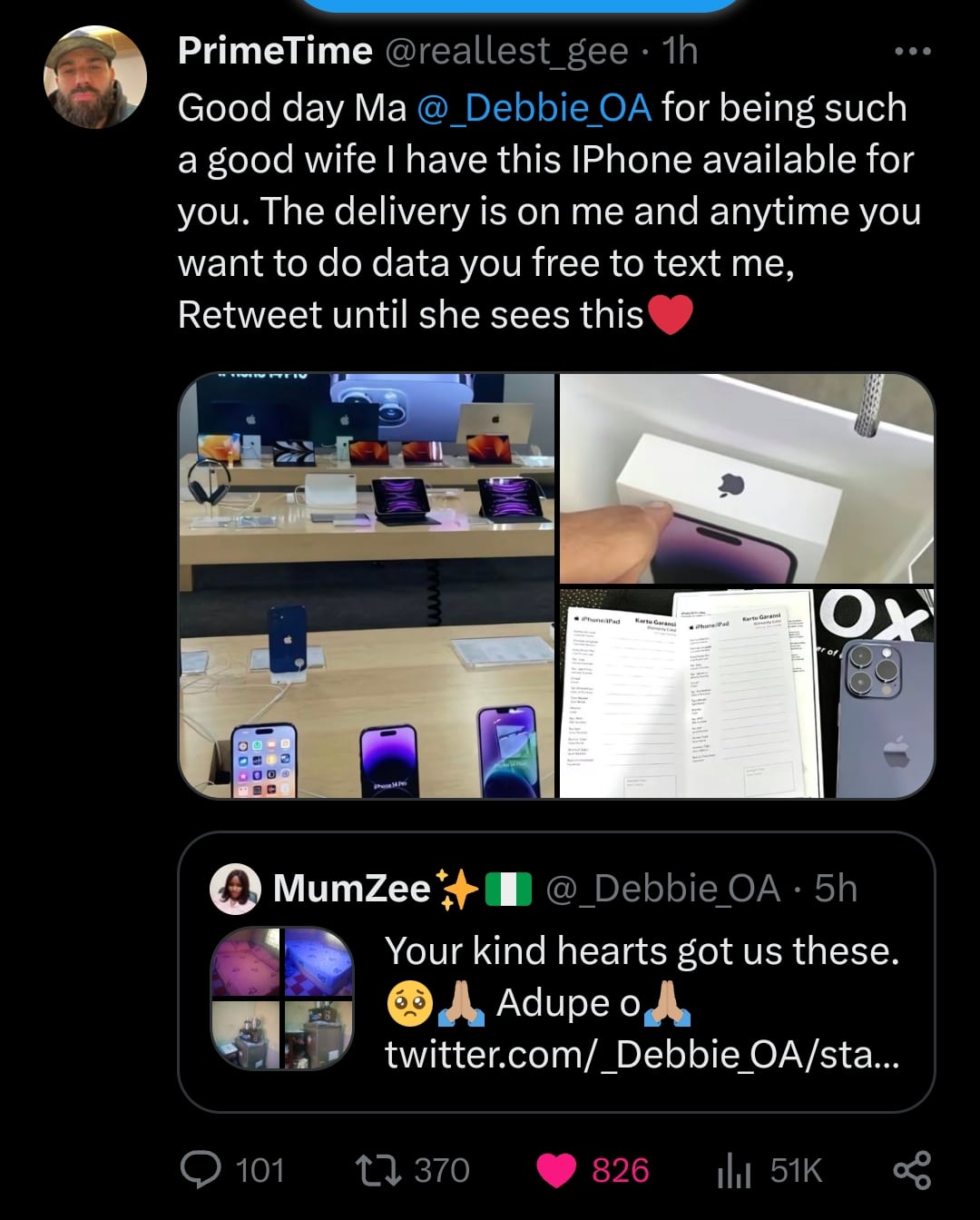 One social media user, @reallest_gee, pledged a brand new iPhone 15, saying, “Good day Ma @_Debbie_OA, for being such a good wife, I have this iPhone available for you. The delivery is on me, and anytime you want to use data, feel free to text me. Retweet until she sees this.”