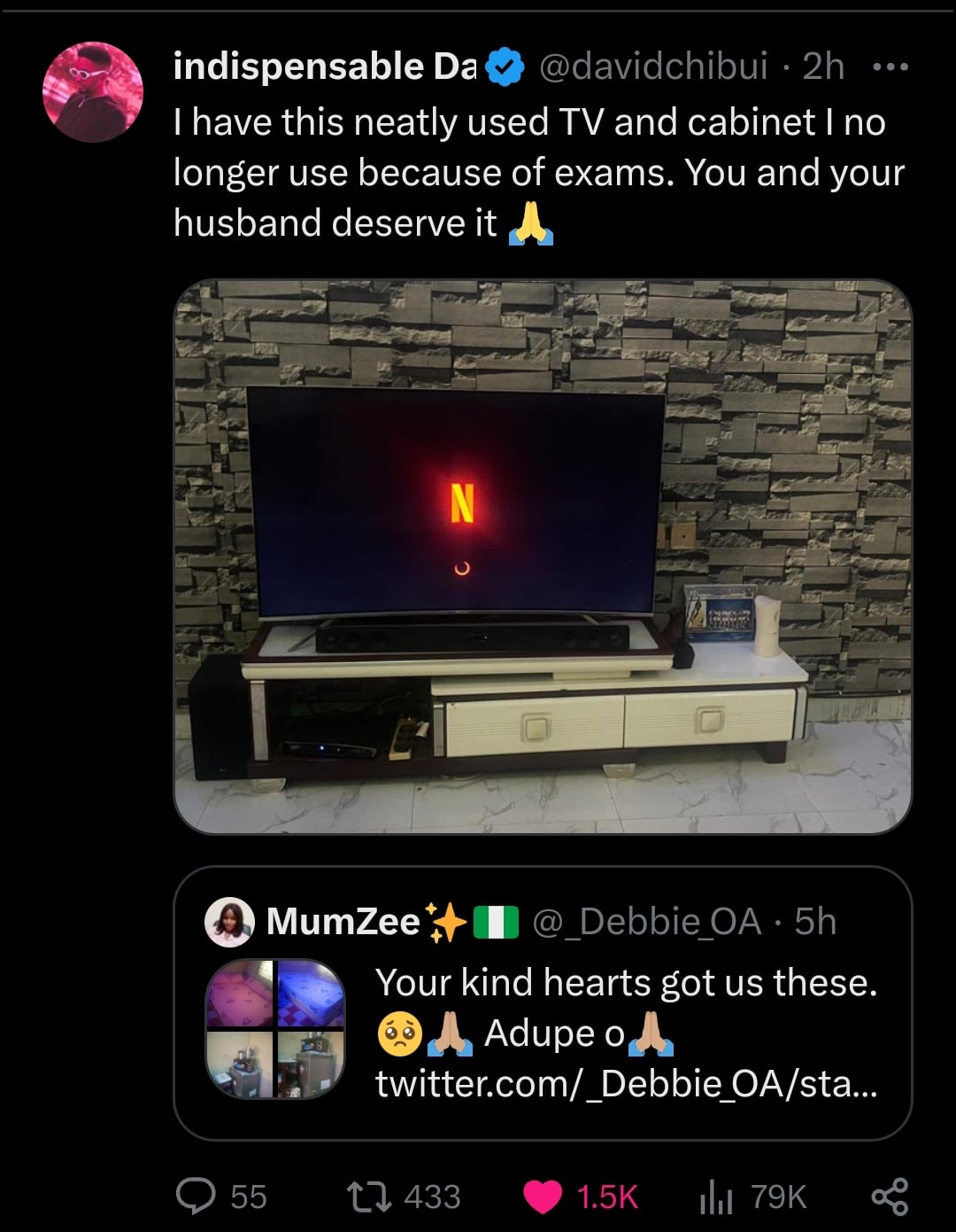 Another user, @davidchibuike_, vowed to gift her a Smart TV, stating, “I have this gently used TV and cabinet I no longer use due to exams. You and your husband deserve it.”