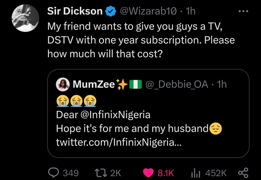 @Wizarab10 also joined the list, mentioning that his friend intends to gift them a DStv. He said, “@Wizarab10, my friend wants to give you guys a TV and DStv with a one-year subscription. Please, how much will that cost?”