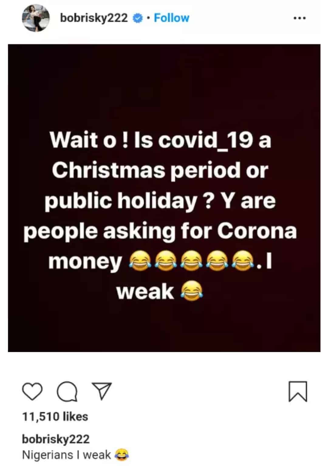 “Is COVID-19 a Christmas period? Why are people asking for corona money?”- Bobrisky