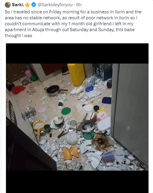 “So I traveled since on Friday morning for a business in Ilorin and the area has no stable network, as result of poor network in Ilorin so I couldn’t communicate with my 1-month-old girlfriend I left in my apartment in Abuja throughout Saturday and Sunday. “This babe thought I was with other women or probably cheating on her and that was why I switched off my phone, coming back to Abuja this is how I met my room, my neighbor said she left around 5 O’clock,” the wrote.
