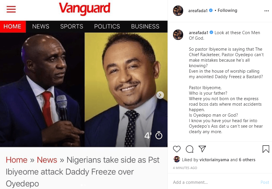 Recall that earlier today, we reported that the cleric rained curses on Daddy Freeze for always ”insulting his father”, Bishop David Oyedepo. Read HERE.