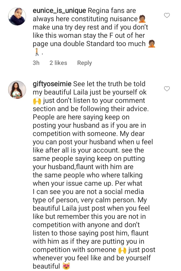 giftyoseimie commented: “See let the truth be told my beautiful Laila just be yourself ok. People are here saying keep on posting your husband as if you are in competition with someone.”