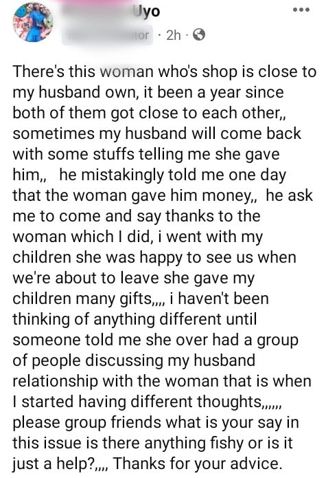 “There’s this woman who’s shop is close to my husband own, it been a year since both of them got close to each other,, sometimes my husband will come back with some stuffs telling me she gave him,, he mistakenly told me one day that the woman gave him money,, he ask me to come and say thanks to the woman which I did, I went with my children she was happy to see us when we’re about to leave she gave my children many gifts,,,, i haven’t been thinking of anything different until someone told me she over had a group of people discussing my husband relationship with the woman that is when I started having different thoughts,,,,,, please group friends what is your say in this issue is there anything fishy or is it just a help?,,,, Thanks for your advice,” she wrote.