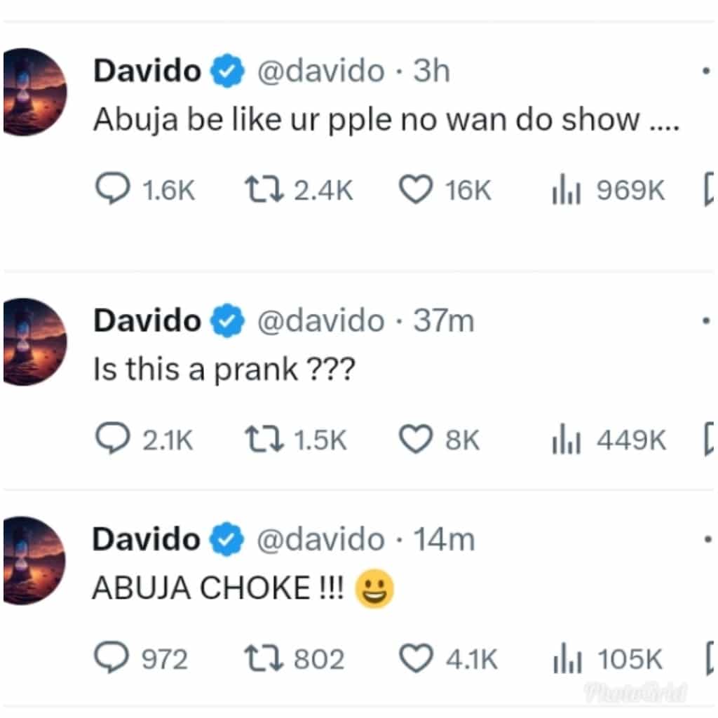 Davido was so shocked by the low attendance at his show in Abuja that he took to Twitter to express his disappointment.